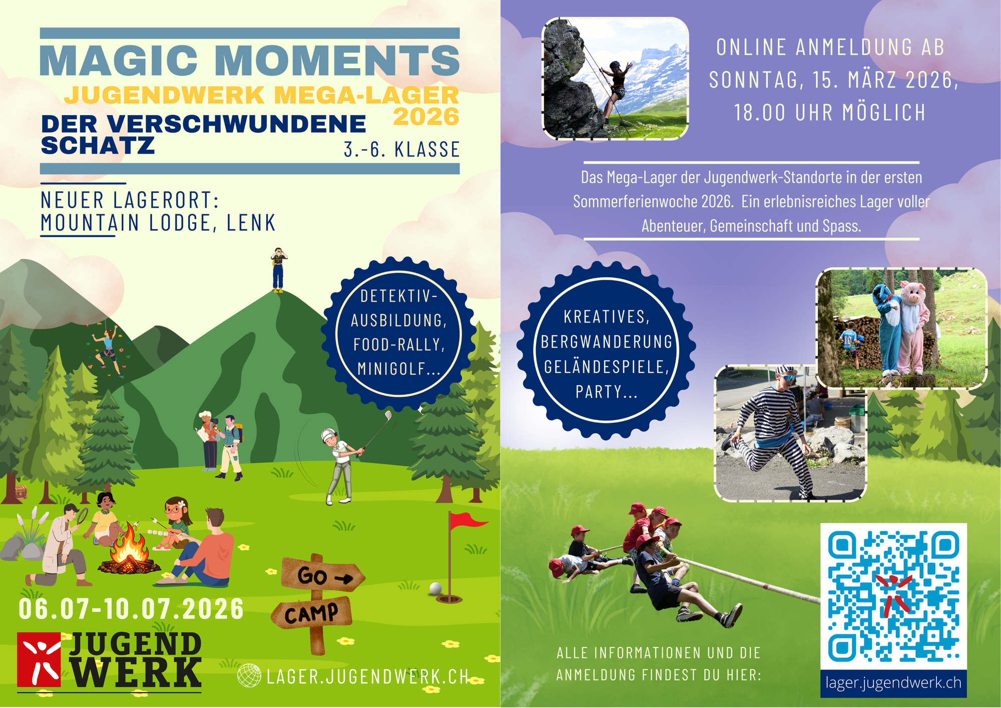 In der ersten Sommerferienwoche organisiert das Jugendwerk das Mega-Lager "Magic Moments". Gemeinsam wollen wir in der Lagerwoche den verschwundenen Schatz wieder finden! Anmelden kannst du dich ab Sonntag, 15. März, 18.00 Uhr. Um dir sicher einen Platz im Lager schnappen zu können, empfehlen wir eine rasche Anmeldung – im letzten Jahr waren nach 45 Minuten alle Plätze ausgebucht.