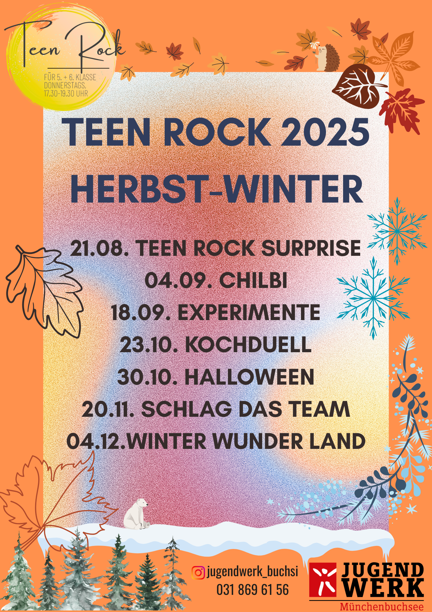 Das Teen Rock richtet sich an alle Kinder und Jugendlichen der 5. & 6. Klasse. Das Angebot findet ca 2 Mal im Monat am Donnerstagabend im Jugendwerk statt und dauert von 17.30 bis um 19.30 Uhr. Im Teen Rock können die Kinder und Jugendlichen ein Abendessen kaufen. Die Flyer mit genaueren Infos findest du auf Instagram: jugendwerk_buchsi